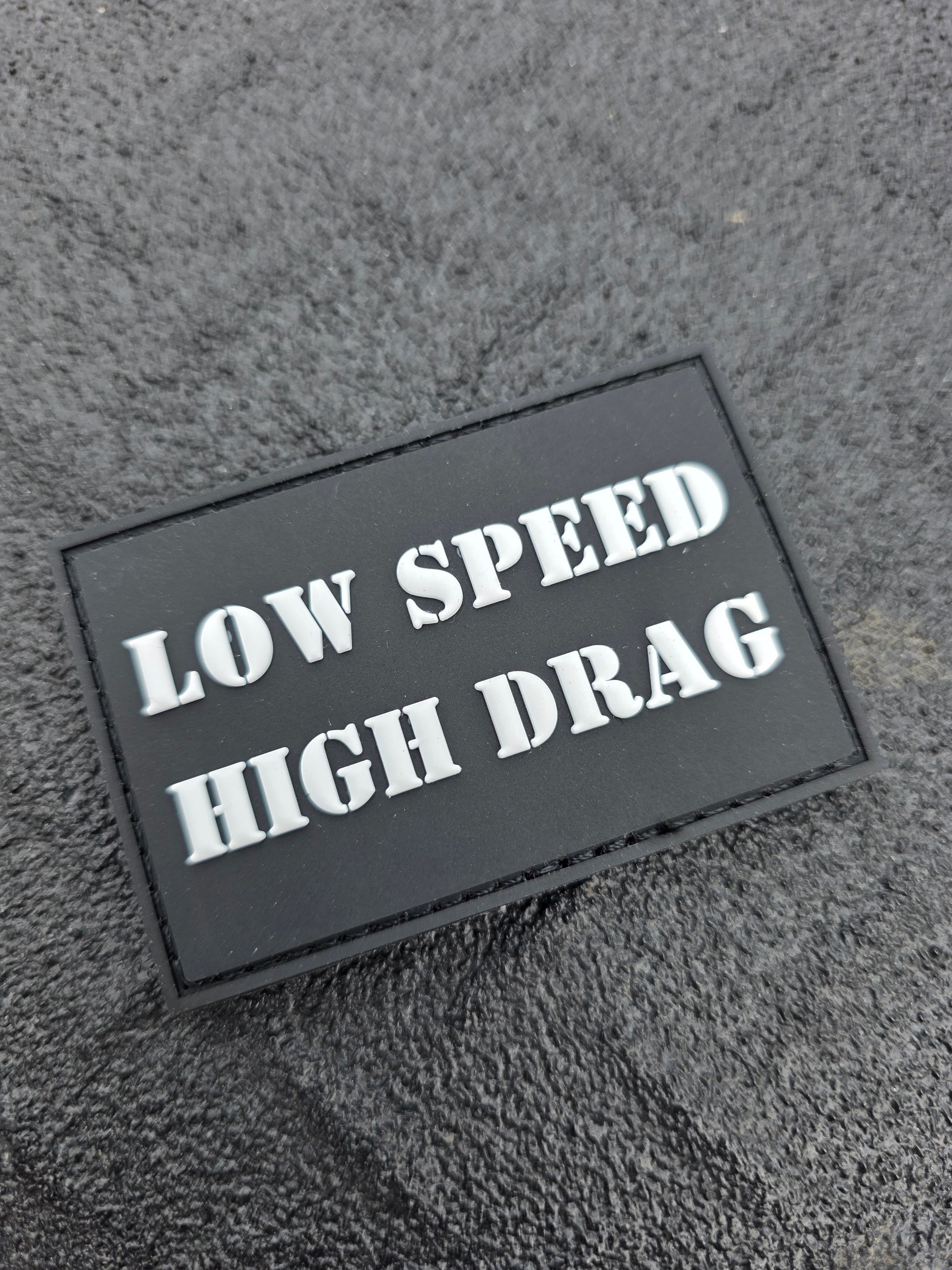 Bring attitude to your gear with this bold “Low Speed High Drag” PVC patch—a clean, no-nonsense design that speaks for itself.